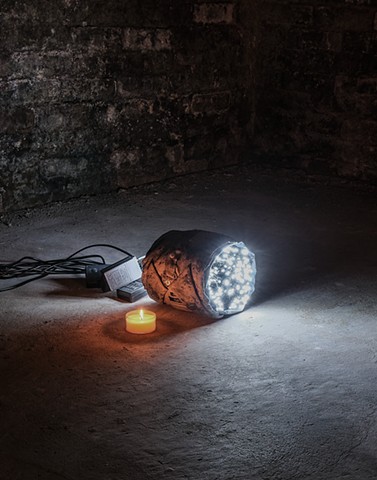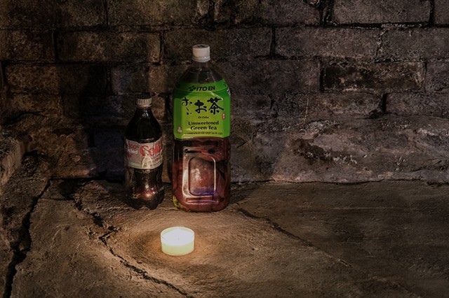Untitled (2411) (detail), Resin, dye, quarters, mochi, Ito En green tea, and Walgreens bags, 13 x 30 x 13 in