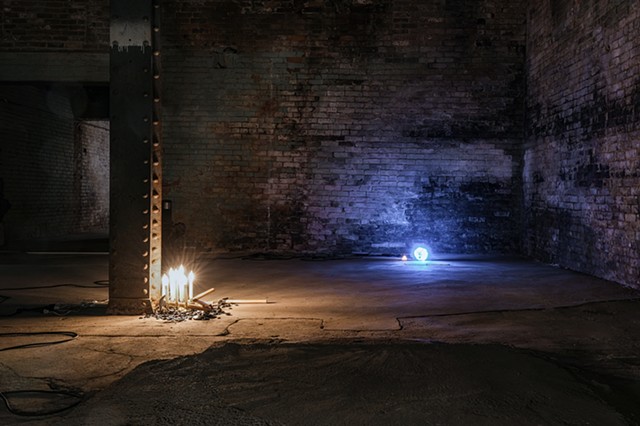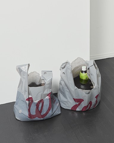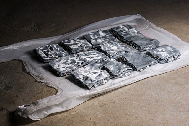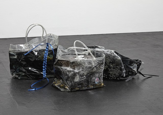 Untitled (2411) (detail), Resin, dye, quarters, mochi, Ito En Green tea, and Walgreens bags, 13 x 30 x 13 in