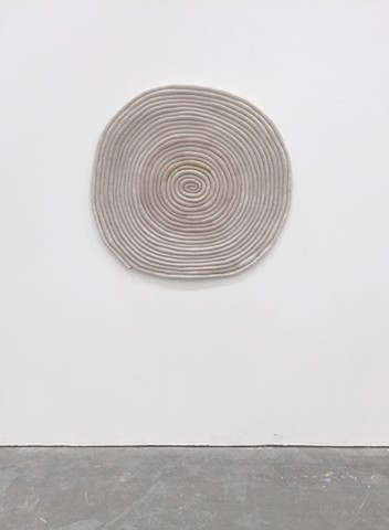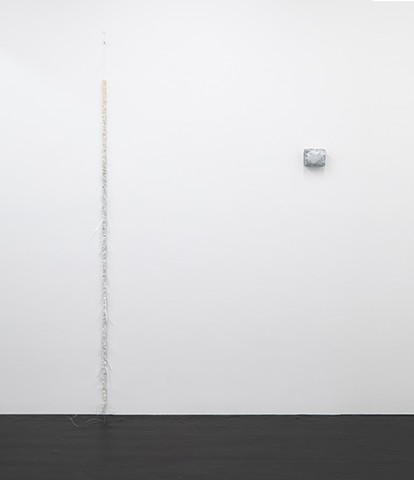 Left: Untitled (2306), Sea shells, crystal heart charm, epoxy, acrylic, colored pencil, graphite, stickers and stainless steel wire, 87 x 3 x 2 in, Right: Untitled (2414), Satin, freshwater pearls and Diet Coke cans, 4 x 5 x 3.5 in