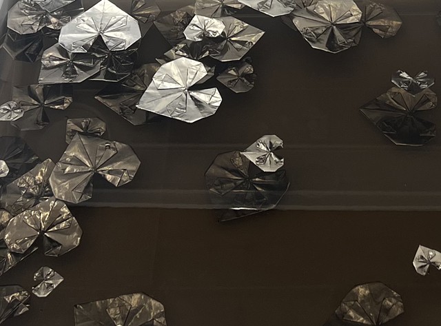 Untitled (2412) (detail), Resin, dye, origami paper, stickers, acrylic, and plastic, 21 x 16 x 5.75 in